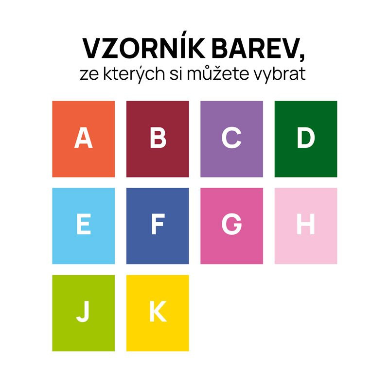 - oranžová, tm. červená, fialová, tm. zelená, sv. modrá, tm. modrá, tm. růžová, sv. růžová, sv. zelená, žlutá